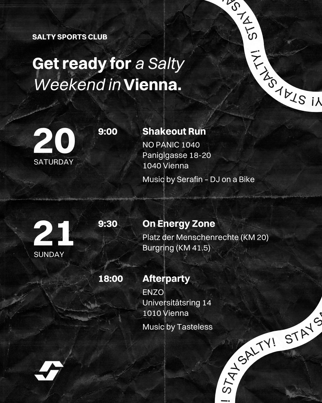 Whether you're racing this weekend or not, we've got some cool events coming up! On Saturday at 9:00 AM, we kick off with a shakeout run through the streets of Vienna, starting and ending at NO PANIC Coffee Vienna (find details below). For everyone who wants to support the Salty Sports family, we have cheering zones at KM 20 and KM 41.5 together with ON! And, of course, we have to celebrate this with some good music and drinks on Sunday night, starting at 6:00 PM at Enzo Vienna! Entry is €10 and free for those who join the shakeout run! Find all the info below.